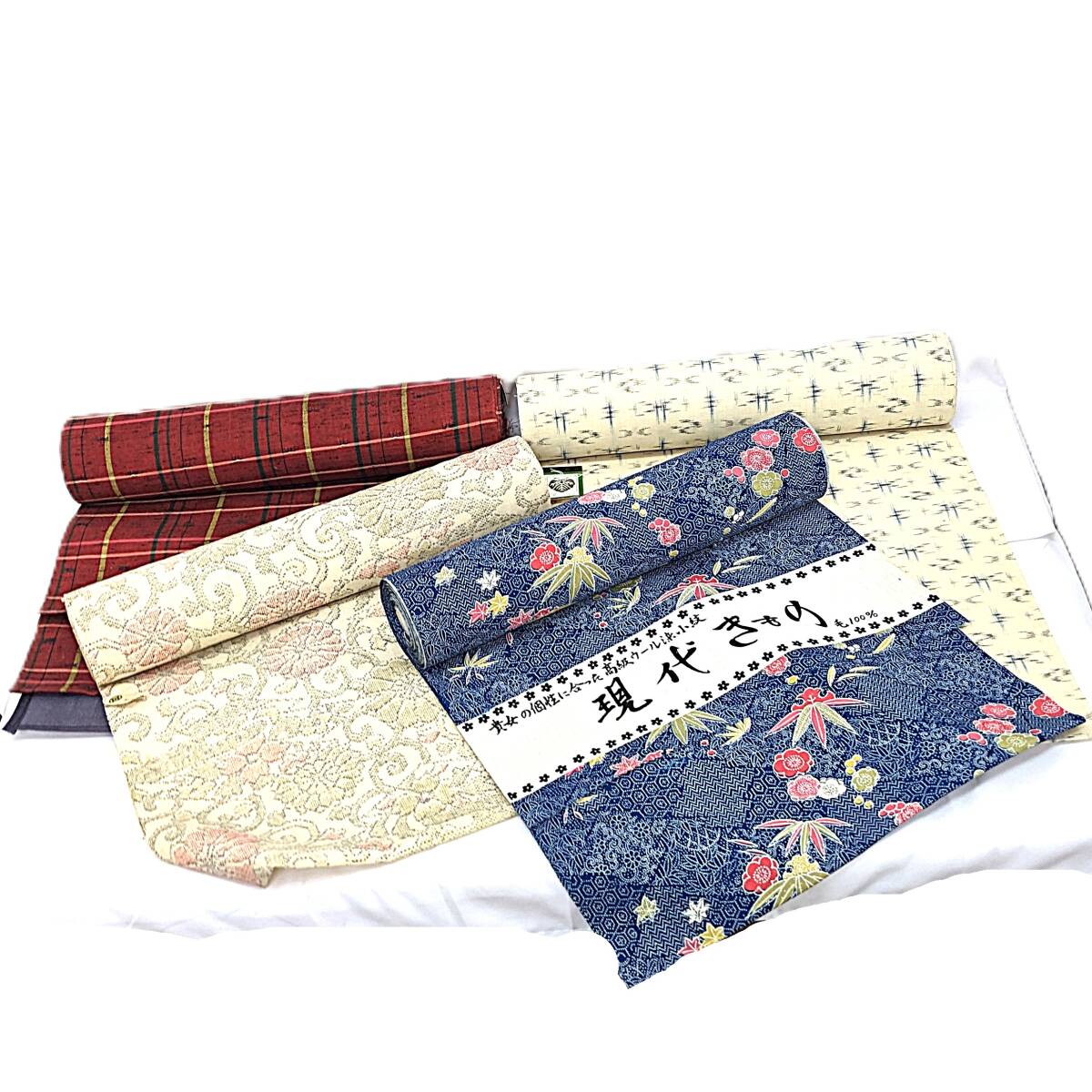 - 【10101】1円スタート 4点セット 着物用 布 生地 現代きもの 高級ウール 100% 染小紋 反物 花柄模様 品質表示 ウール 絹 アクリル 別織