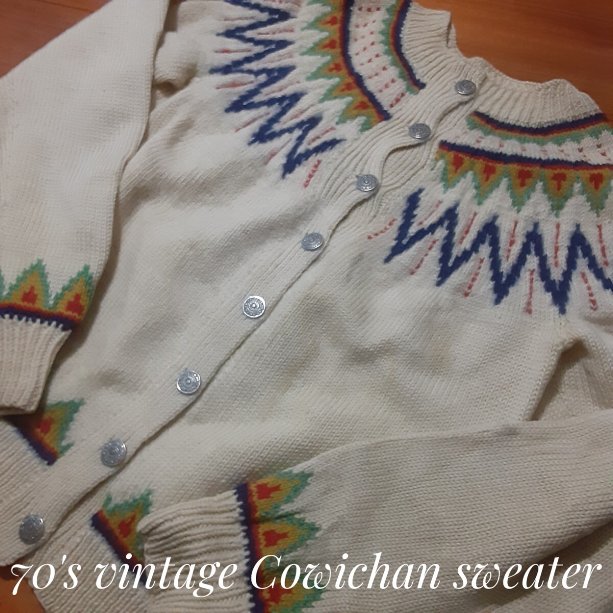 > 最値!希少70'sヴィンテージ!雪柄 カウチン セーター カーディガン!アメリカ古着!ベージュ×ノルディック柄!肌色 メンズ S相当
