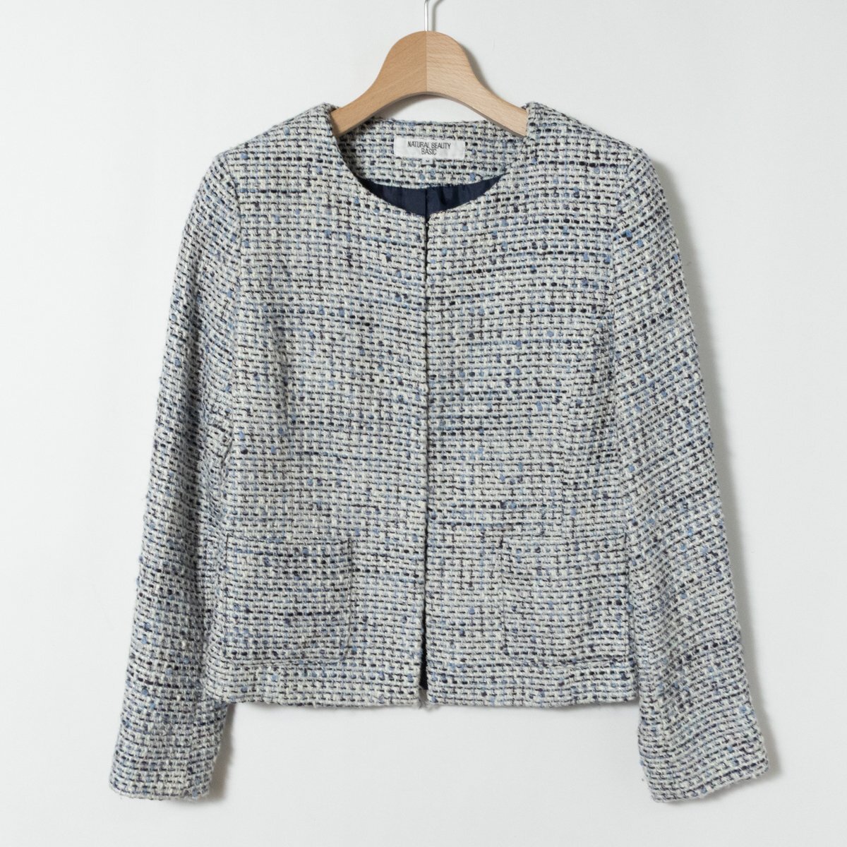 > NATURAL BEAUTY BASIC ナチュラルビューティーベーシック ノーカラーツイードジャケット ホワイト ブルー M アクリル コットン セレモニー