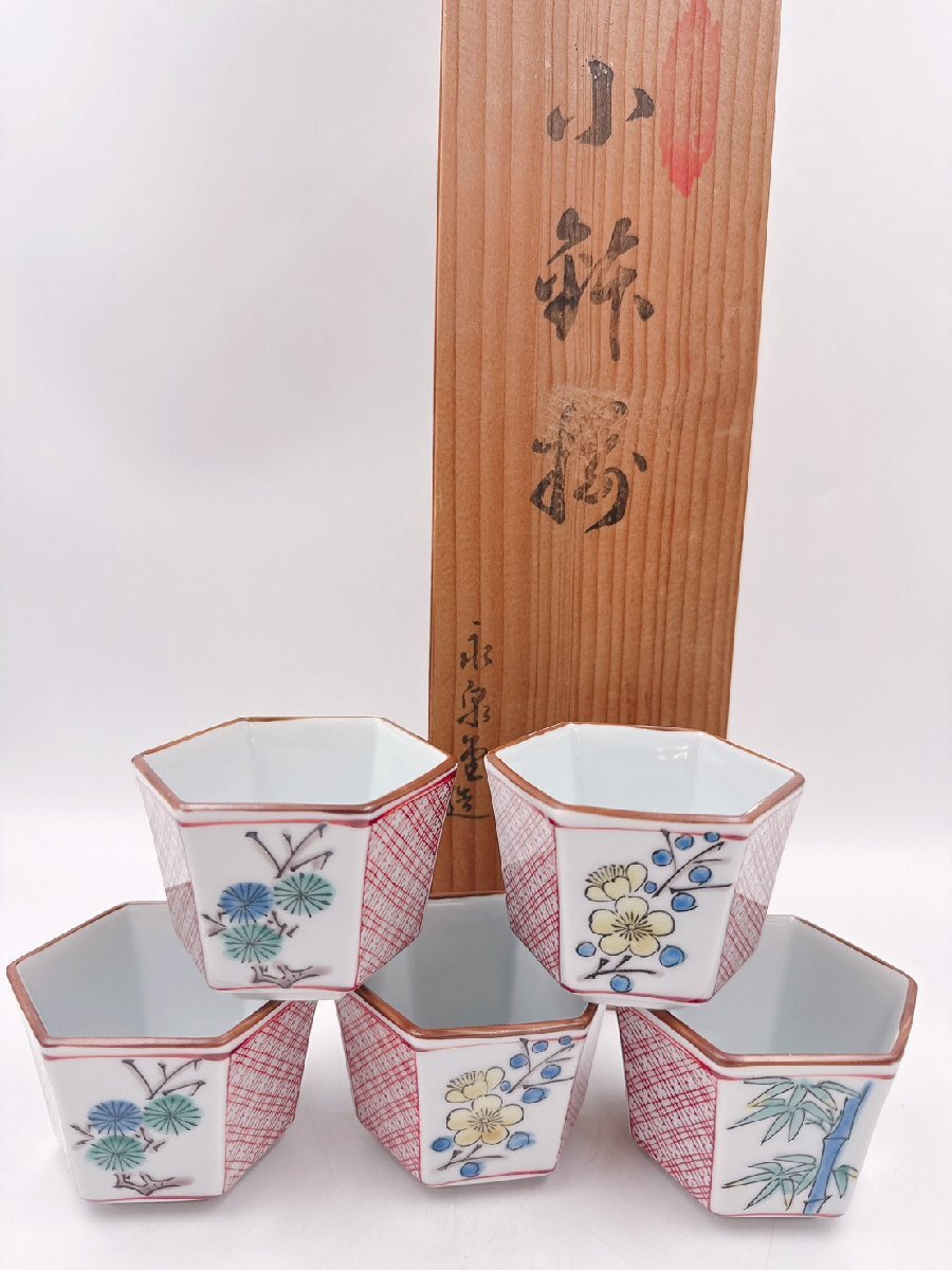 - 1円【未使用】九谷焼 永泉 永泉窯 六角形 小鉢 5客 共箱付き 現状保管品【KO038】