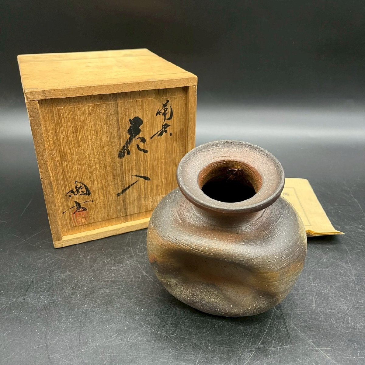 - OM0916-13‐3 備前焼 備前 壺 花器 花瓶 花入れ 陶器 陶芸 伝統 工芸 骨董 置物 インテリア 木箱 高さ12㎝ 口径4.5㎝ 60サイズ