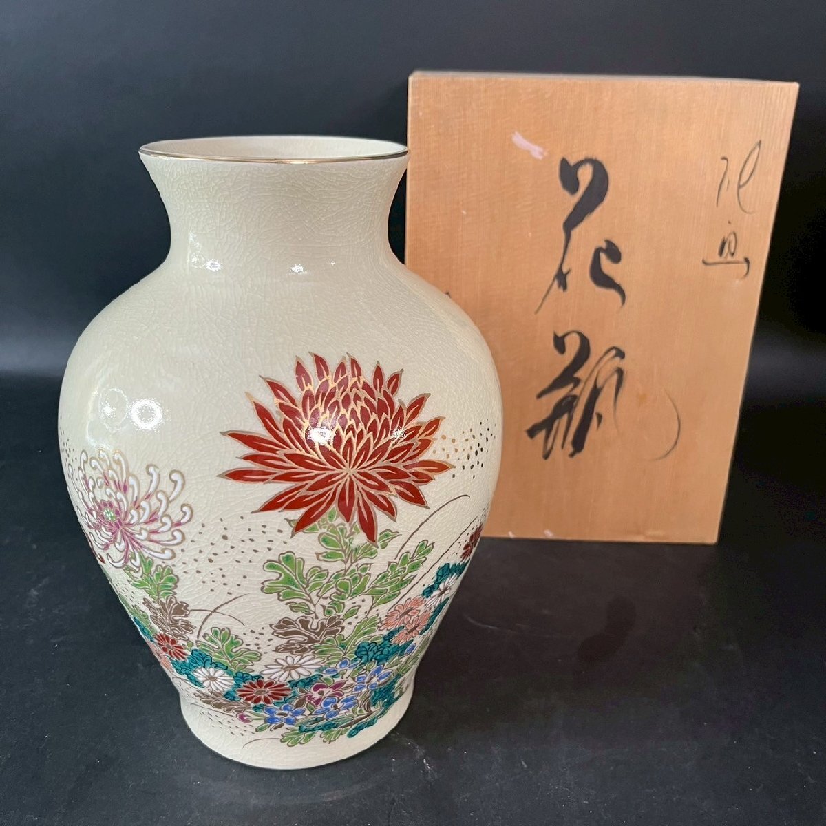 - OM0919-6-7‐3 明陶 花瓶 花器 花入れ 壺 金彩 色絵 菊 陶器 陶芸 伝統 工芸 骨董品 木箱 置物 インテリア 高さ24.5㎝ 口径9.3㎝ 80サイズ