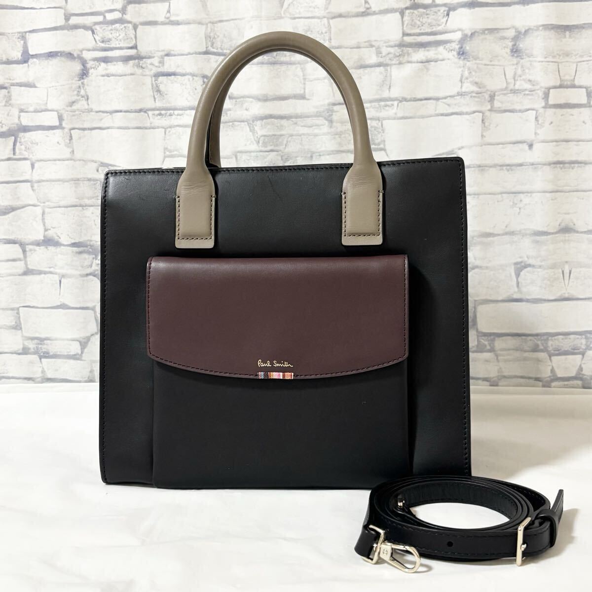 - 1円【極美品】Paul Smith ポールスミス・2way ハンドバッグ ショルダーバッグ レザー ブラック×ボルドー×グレージュ系