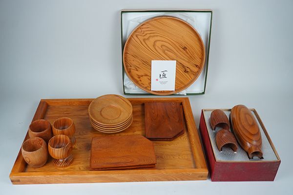 - D-339■古い屋久杉造り 長盆丸盆(未使用)茶托菓子皿まとめ売り