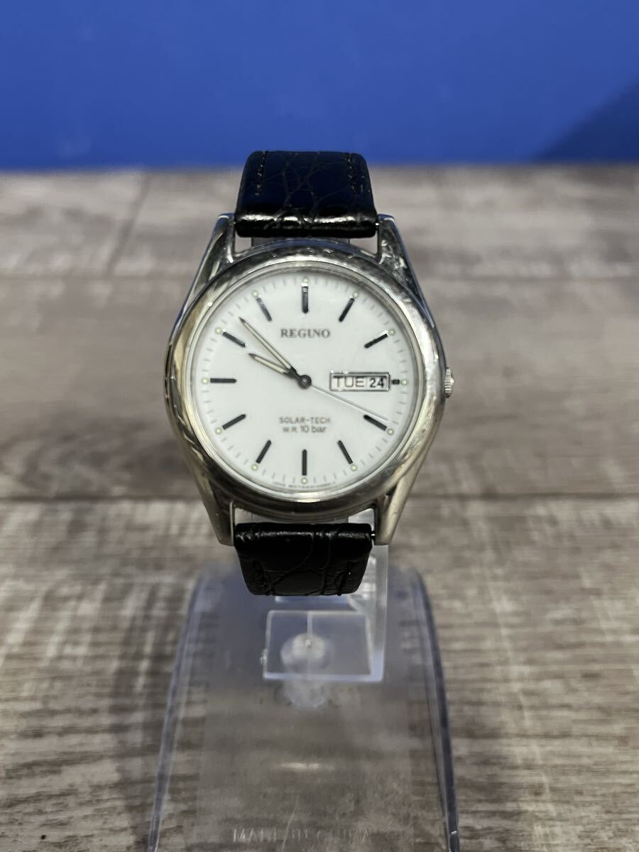 - CITIZEN シチズン 腕時計 レグノ E101-K005299 ソーラーテック 白文字盤 デイデイト 革ベルト 稼動品