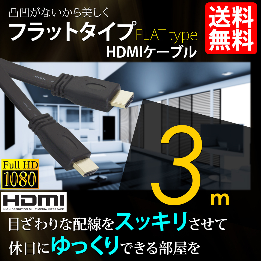 - HDMIケーブル フラットタイプ ハイビジョン 4K 3m 3メートル 3D対応 Ver1.4 PC モバイル 国内検査後出荷 ネコポス 送料無料