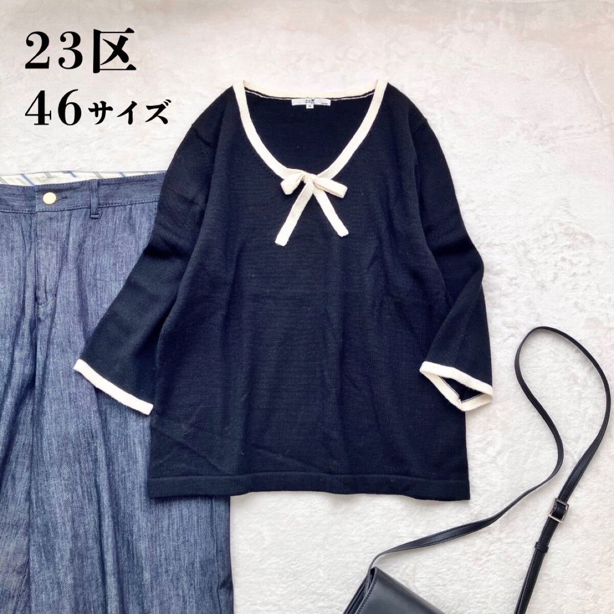 > 23区 大きいサイズ46 ウール100% バイカラー リボン ニット XXXL 4L 3XL ニジュウサンク チュニック セーター ゆったり トップス