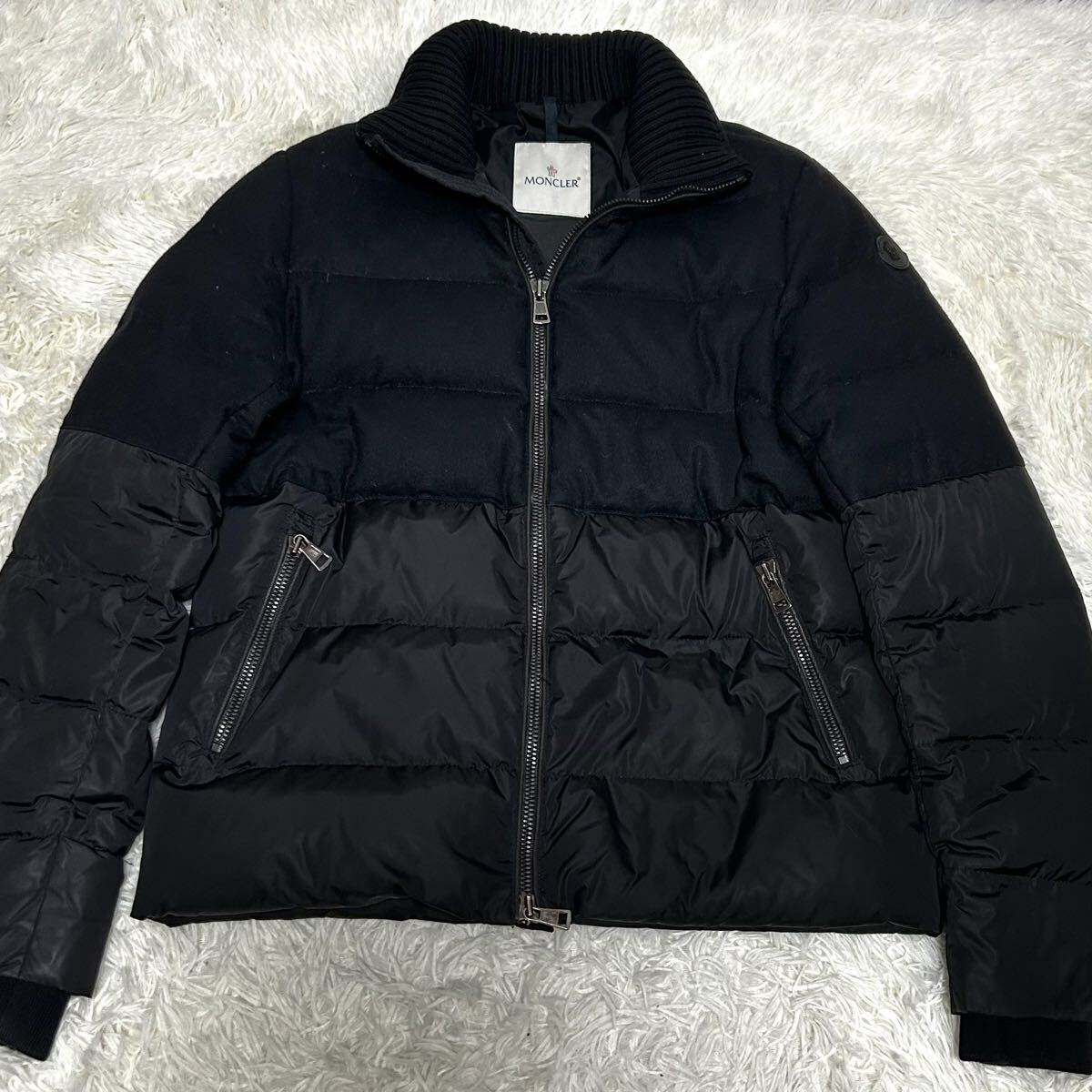 - 美品 代理店タグ有 モンクレール MONCLER ブラック ダウンジャケット 黒 ロゴワッペン ウール切り替え リブニット アウター 3 L相当 noir