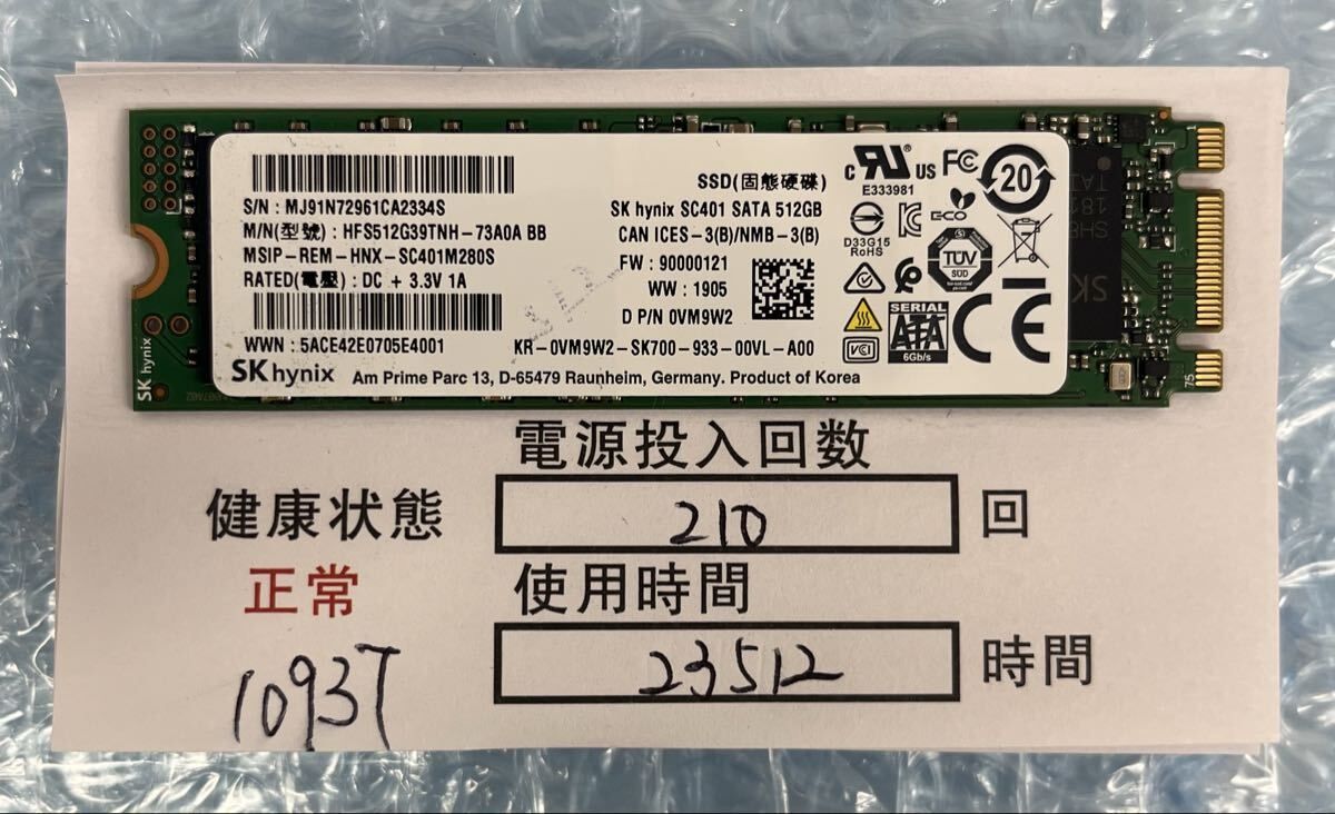 - 10937/中古品/M.2 SSD/SATA/2280/SK hynix/512GB/動作確認済み/返品返金対応/納品書発行可(商品説明文ご確認下さい)