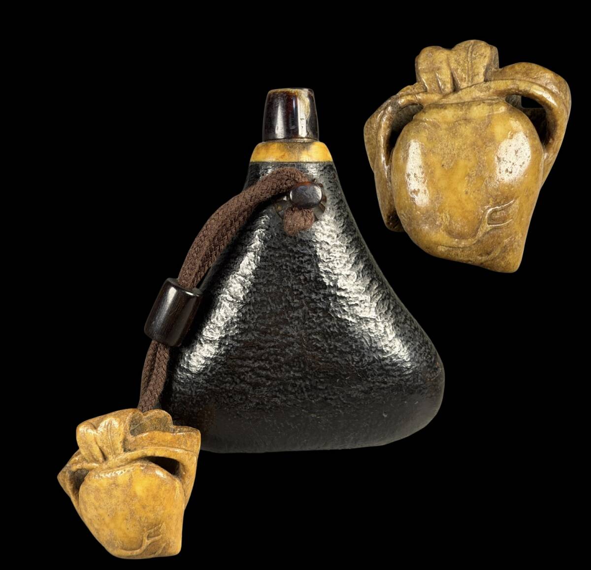 - 【偲】鯨歯風 天然素材 根付付き火薬入れ 提げ物 古道具 時代もの r-1051