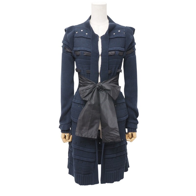 > MH9870〇イタリア製*レッド ヴァレンティノ*リボントリム ウエスト紐*コットン*透かし ニットカーディガン*USA S*ネイビー×ブラック