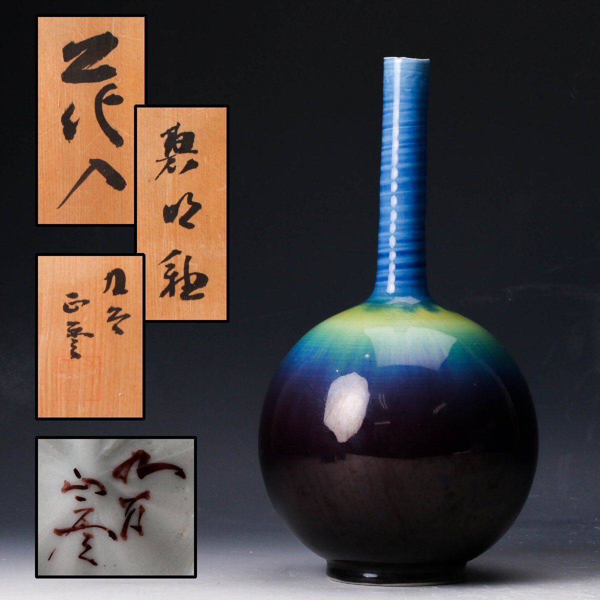 【佳香】人間国宝 三代 徳田八十吉(正彦) 碧明釉花入 共箱 栞 本物保証拍卖