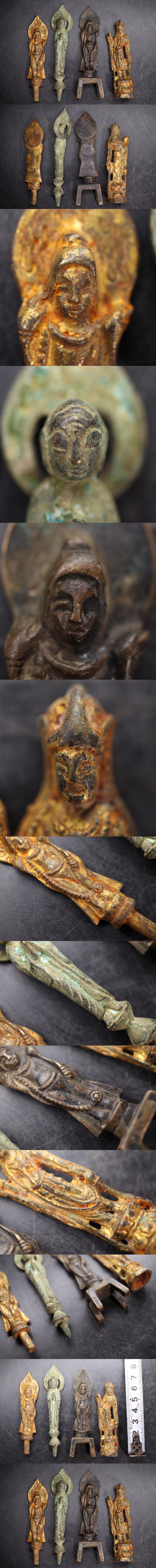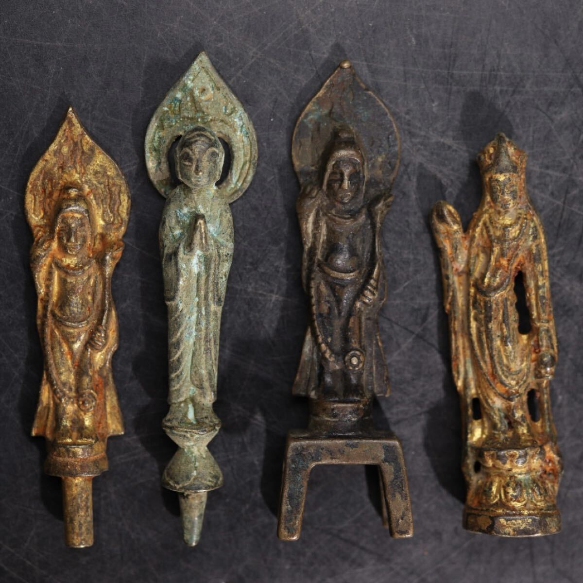 - 時代 古銅 豆仏 四体 / 仏教美術 仏像 阿弥陀如来 観音菩薩 銅 金塗 金工 彫金 .G2951