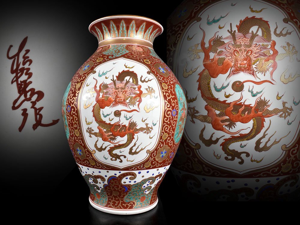 > 【雲】某資産家買取品 豪華絢爛 金襴手 雲龍唐草豪快絵付 特大花瓶 高さ61cm 在銘(壺飾壷)J1968 UTUbgfr