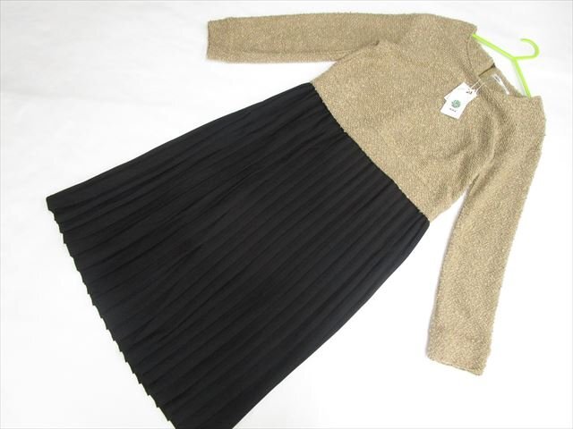 - キッズ 新品タグ付 イッカ ikka 洗える ロング丈 長袖 ラウンドネック プリーツスカートドッキングワンピース 150 ベージュ×ブラック