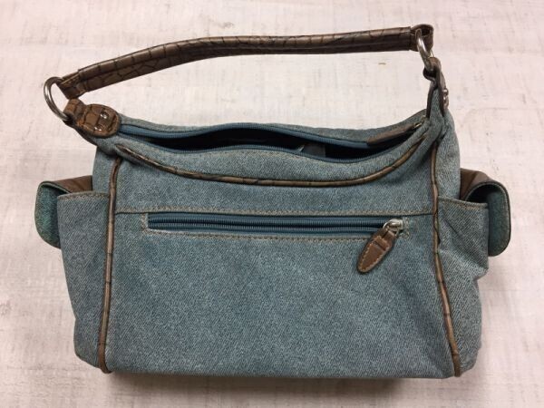 - iii sanpo オールド レトロ 古着小物 キャンバス × クロコ柄型押しレザー ハンドバッグ カバン レディース 青