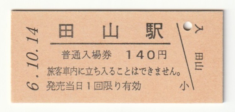 - 平成6年10月14日 花輪線 田山駅 140円硬券普通入場券(日付印刷)