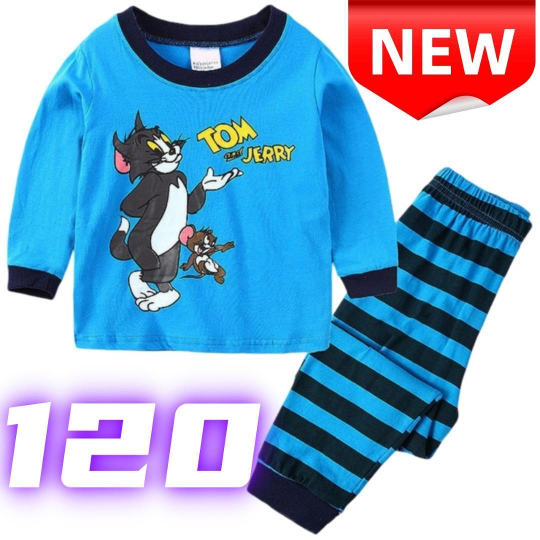 - [新品]トムとジェリー パジャマ 子供服 長袖 上下セット キッズ 男の子 女の子 ルームウェア 120cm ブルー ネイビー ボーダー柄 綿 春秋冬