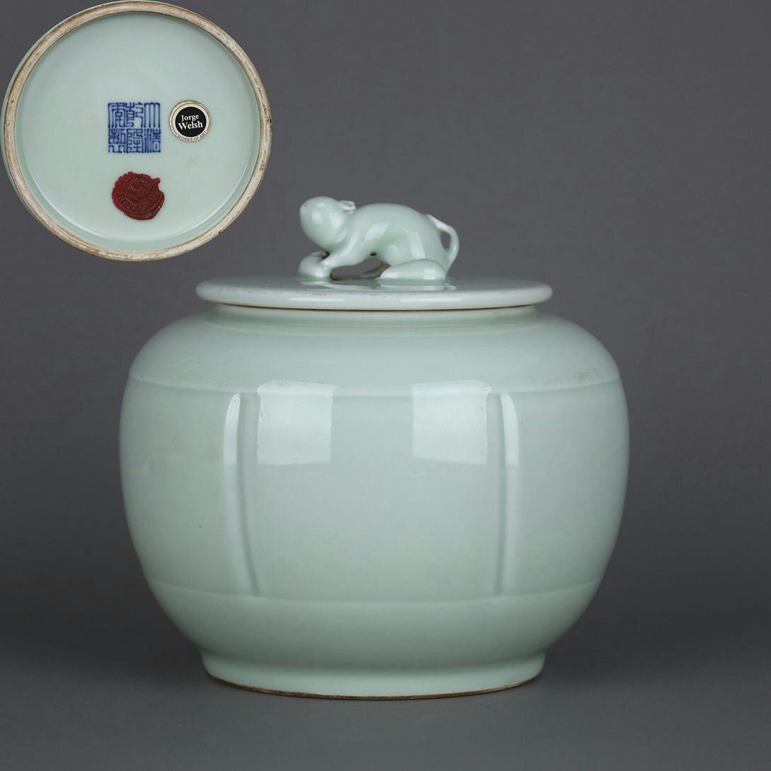 - ▼渡鶴羽▼H7273清乾隆 豆青釉招財鼠棋子罐・時代物・古陶磁・古賞物・旧家買出品