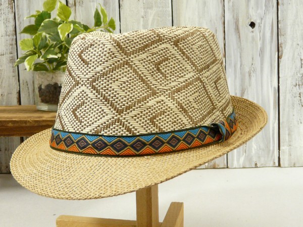 - 全国一律送料450円 ストローハット 編み込み スエスニックベルト ブラウン 男女OK パナマ ボルサリーノ 麦わら 中折れ