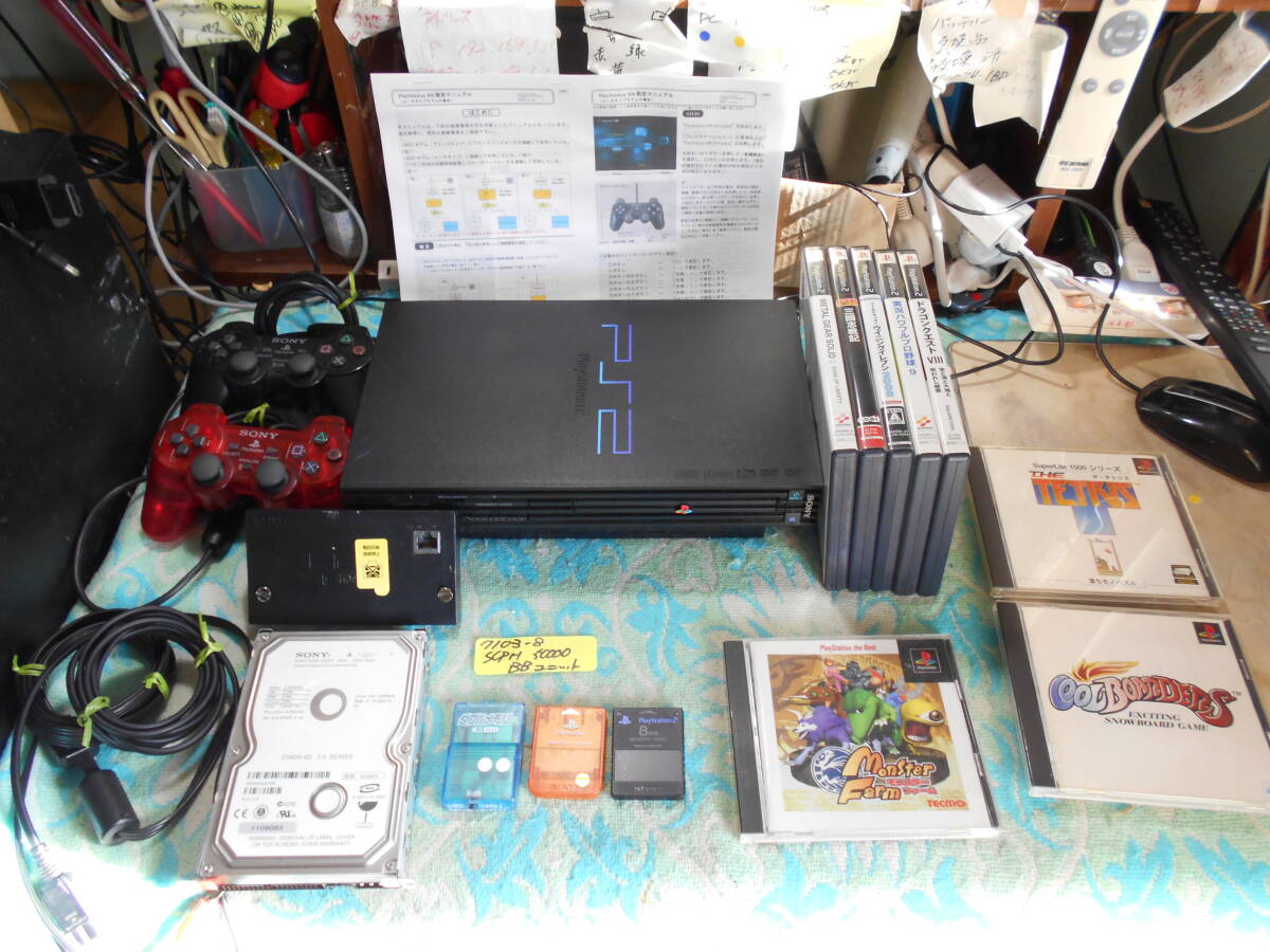 - 7103-8 SCPH50000 BB付 PS1,PS2 動作品セット、メモリ2枚、ソフト8枚、電源、接続コードなど、動作チェックに使用した一式