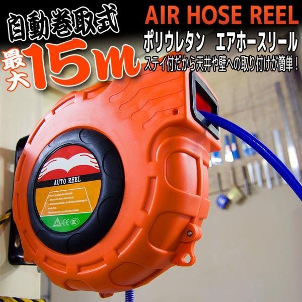 - エアーホースリール 自動巻き 壁掛け 15m エア工具 エアツール 自動巻取式 吊り下げ式