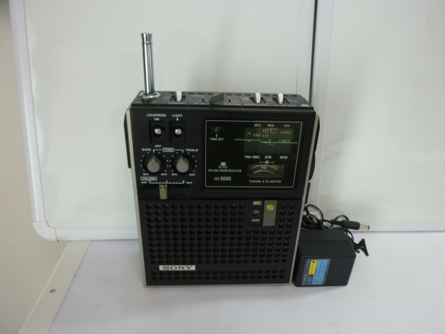 sony ICF-5500です。FM.MW.SWの受信確認が出来ました。アンテナポップアップ、ライト、TONE調整、LOUDNESS、AFC/MW SENS、メーター、タイマー(ゼンマイ式の為正確性の保証は出来ません)OK、電池室もきれいです。付属品はsony製のACアダプターになります。全体的に綺麗な状態ですが古い商品のため、擦り傷、汚れ、へこみ、サビ、受信感度低下、接触不良、チューニングメーターのズレ等が有る場合も有りますので、ご理解の上NC.NRで宜しくお願いします。発送は80サイズ元払いとなります。