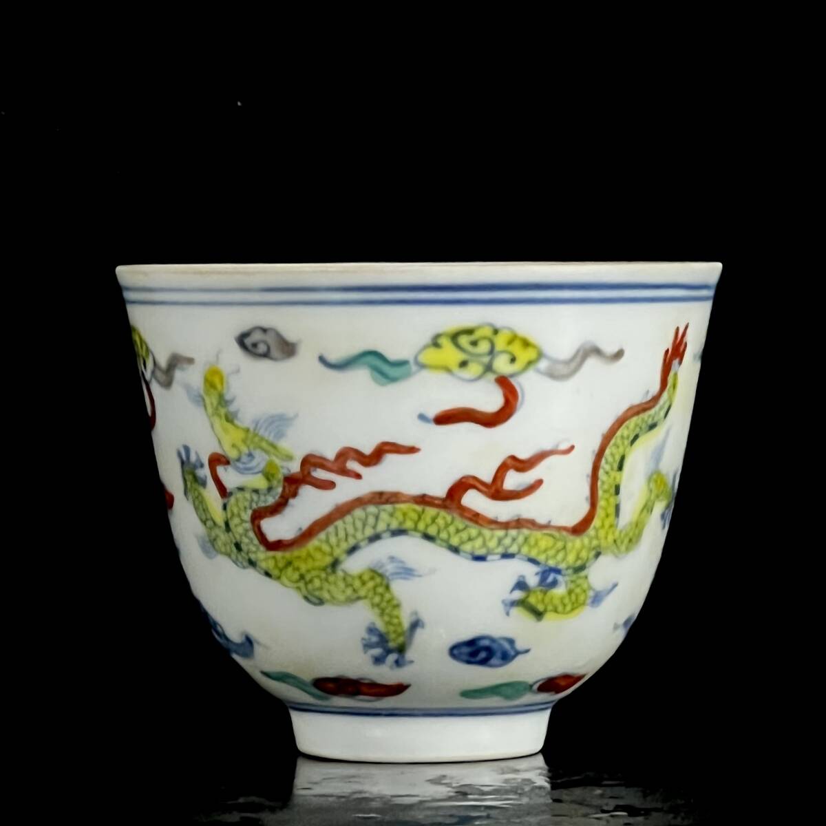 - 明時代 成化年製款 古陶磁器 青花 斗彩 龍紋 茶具 茶杯 茶道具 文案置物 時代物 骨董品 旧家蔵出し 唐物 中国古美術