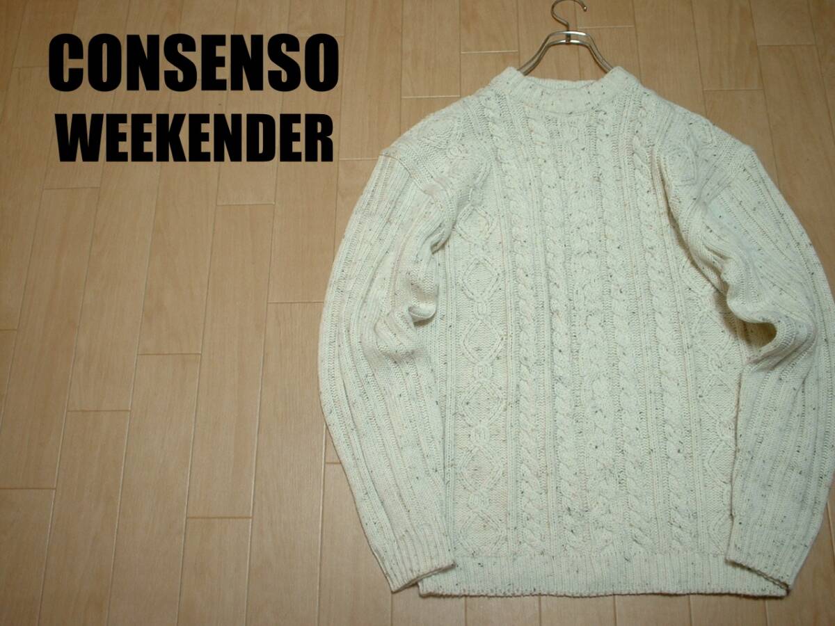 > CONSENSO WEEKENDERフィッシャーマンズウールセーターXLネップ入り白オフホワイトモックネックアランノルディック編みケーブルニット霜降り