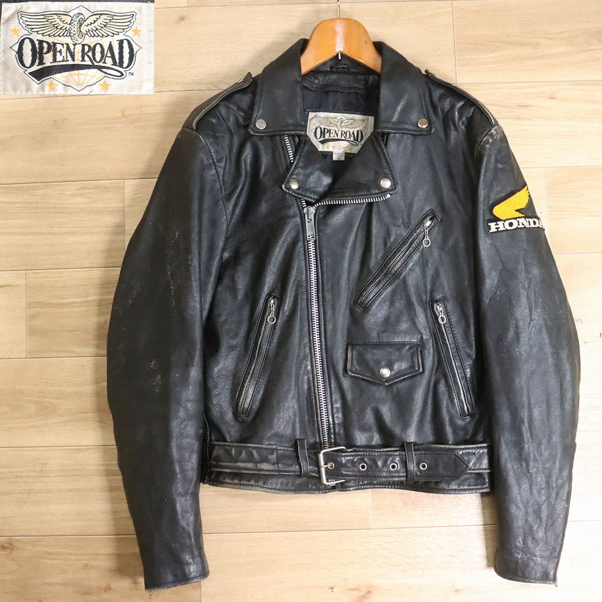 - G3O/Y5.13-1 アメリカ古着 OPEN ROAD ダブルライダース 本革 革ジャン 皮ジャン レザージャケット レザーブルゾン ブラック系