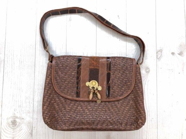 - ITALY製 レトロ モード Pier Giorgio 編み込み カゴ 本革レザー切替 肩がけ ショルダー バッグ カバン レディース 茶色