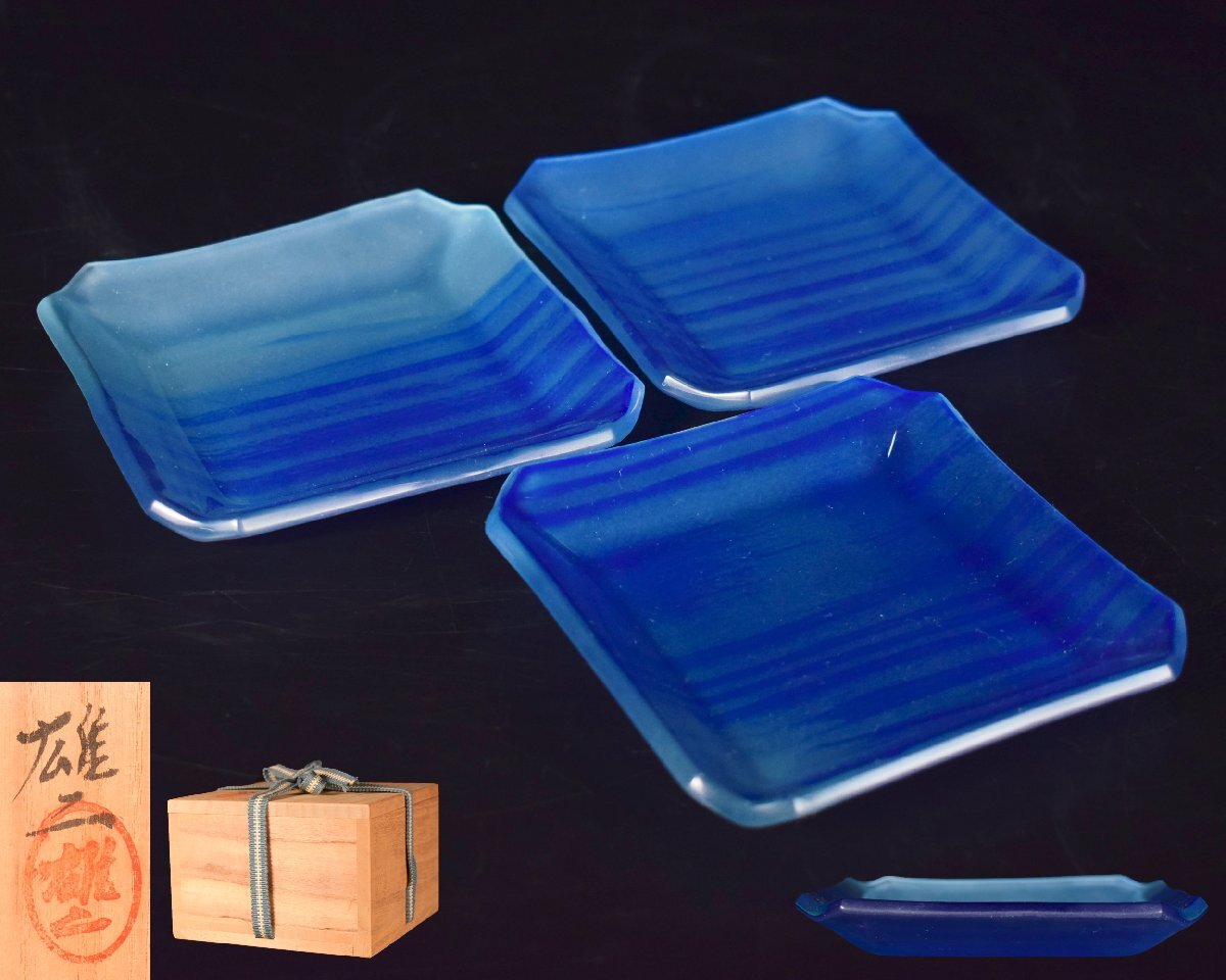 X845 【泉美】濱地雄二作 ガラス 角木目 銘々皿 小皿 3客 懐石道具 共箱入拍卖