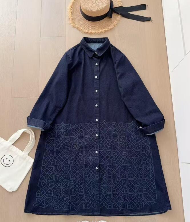 - 新入荷 シャツワンピース 刺繍 カーディガン 羽織物 ロングトップス チュニック ゆったり 綿100% ナチュラル 縫い合わせ デニム