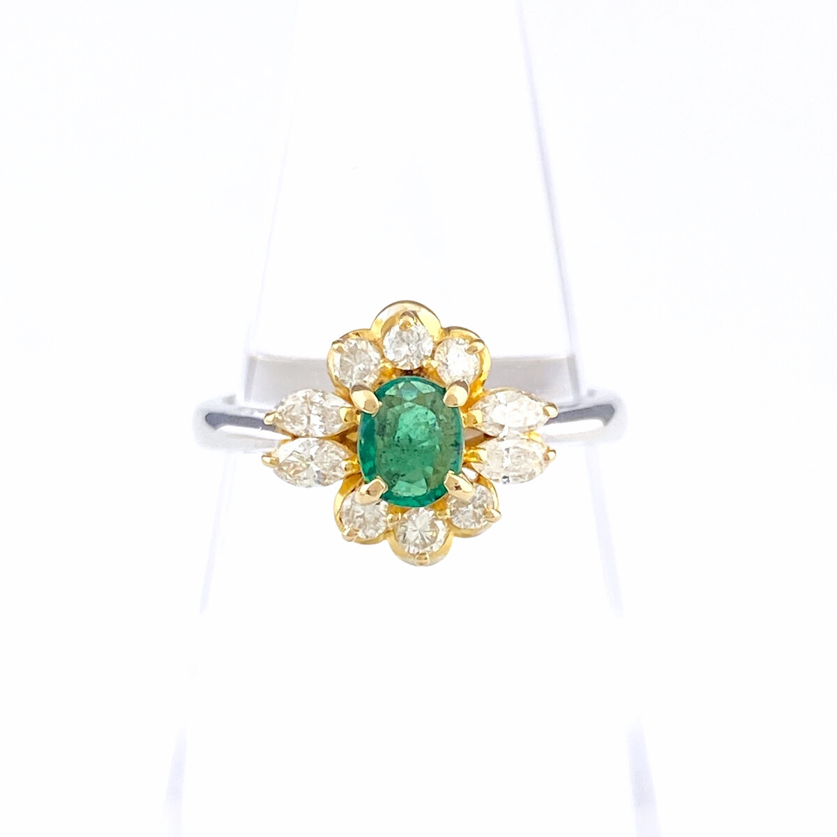 > エメラルド デザインリング プラチナ YG イエローゴールド 指輪 メレダイヤ リング 9号 Pt900 エメラルド ダイヤモンド レディース 中古