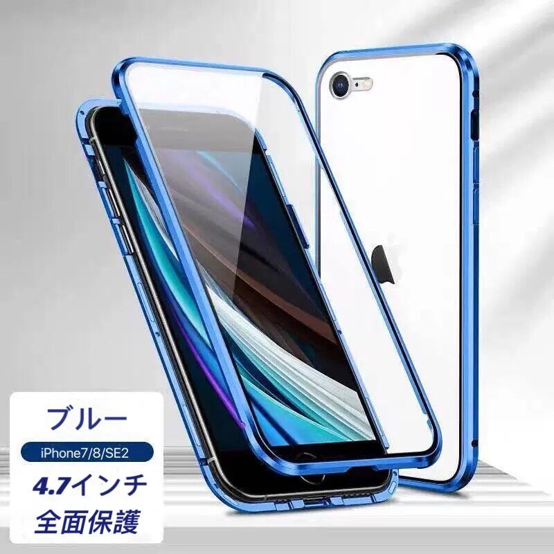 - iPhone 7/8/SE2/SE3 ブルー 両面強化ガラス 全面保護 アルミ合金 磁気吸着 耐衝撃 iPhoneX/XS/XR/12/12Pro/XSAMX/7Plus/8Plus ケース