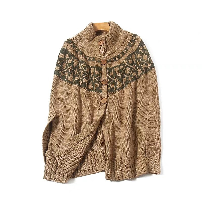 - ゆったり 暖かな すっぽり包まれる ニットポンチョ ブラウン カーディガン ベージュ 北欧柄