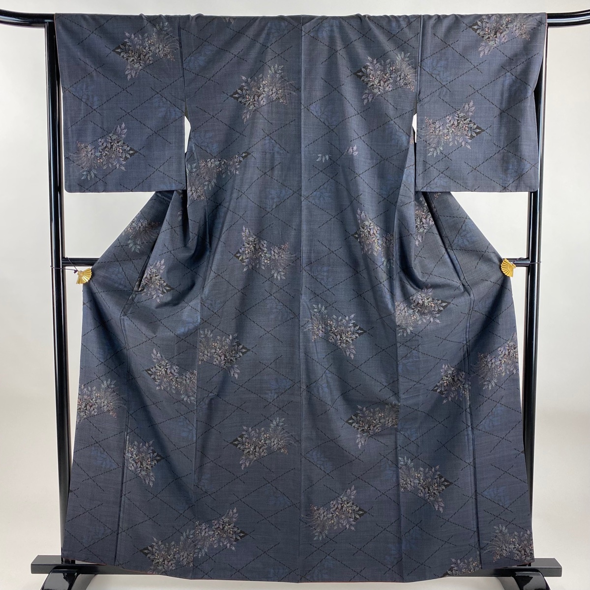 - 【美品】 紬 身丈162cm 裄丈65cm M 袷 草花 幾何学 濃紺 正絹 秀品 【中古】