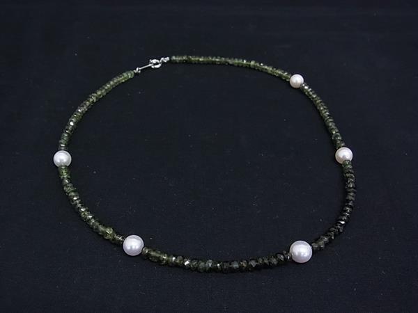 > ■美品■ SV925 天然石 トルマリン パール ネックレス アクセサリー レディース カーキ系×シルバー系 DK2769