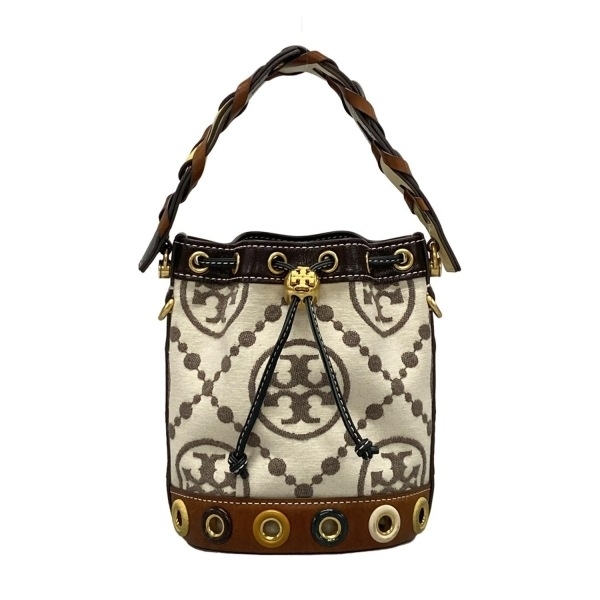- トリーバーチ TORY BURCH ハンドバッグ Tモノグラム レザー アイボリー×ダークブラウン×マルチ 巾着型/型押し加工 バッグ