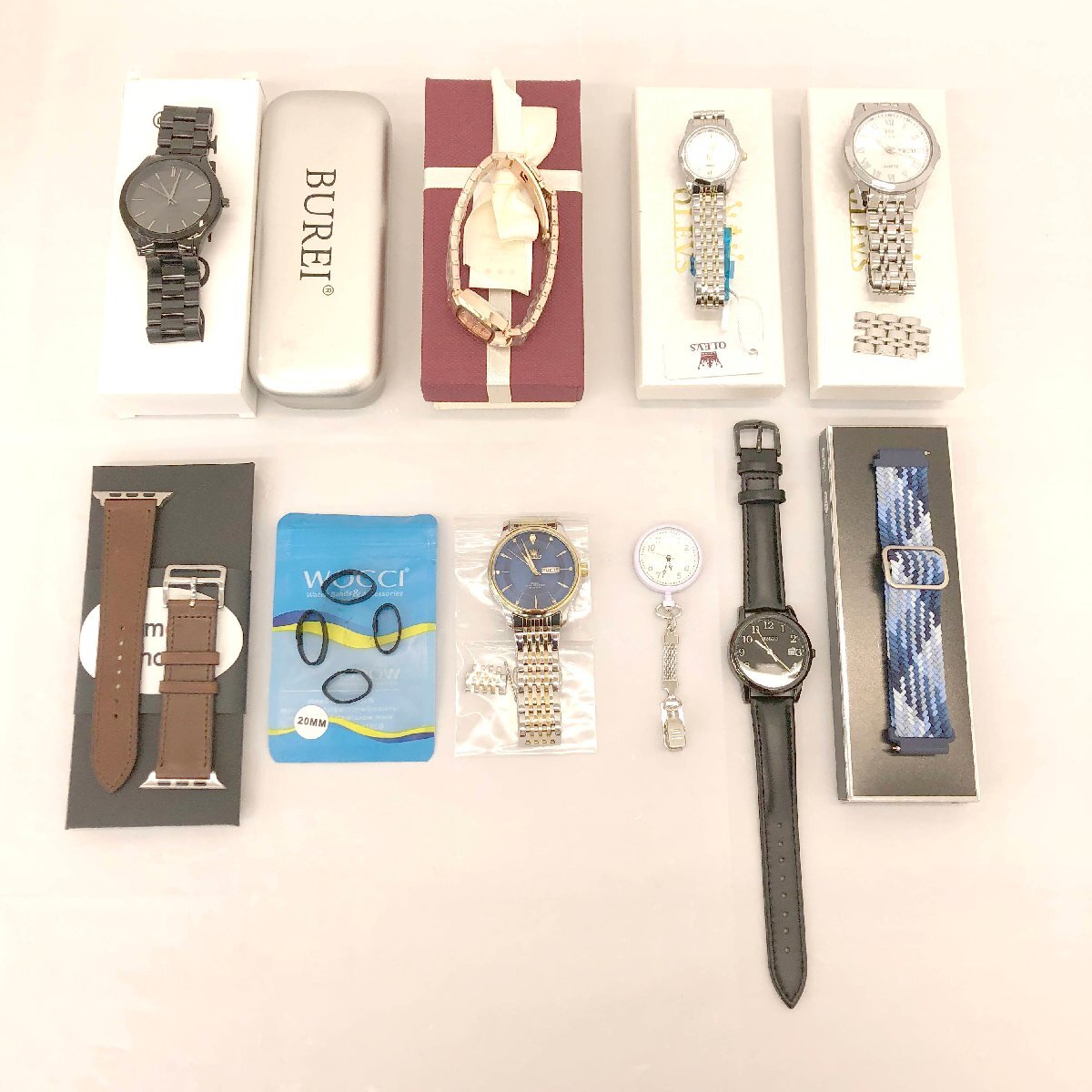 > 1548〒「腕時計等10点(電池切れ含む)まとめ売り」BUREI・OLEVS・DIZIZID・交換用ベルト・栃木レザー NC/NR【0513】