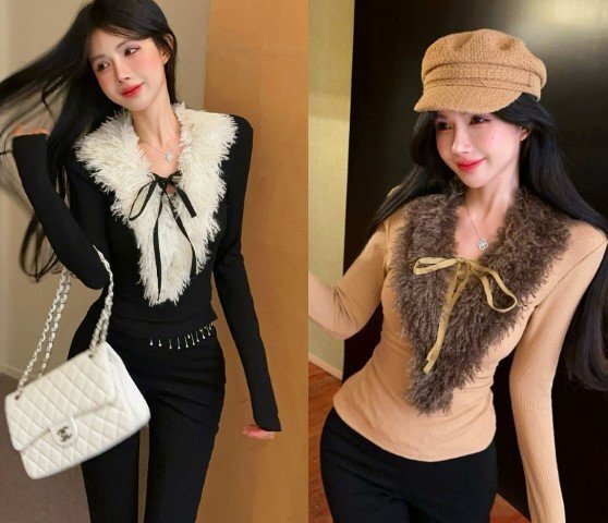 - トップス 長袖 ファー付き シンプル カジュアル フェイクファー もこもこ ふわふわ かわいい S ブラック