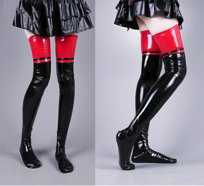 - 新作 XLサイズ 黒・赤 PUエナメル光沢仕上げ ・ニーハイ丈ストッキング コスプレ衣装8040-26