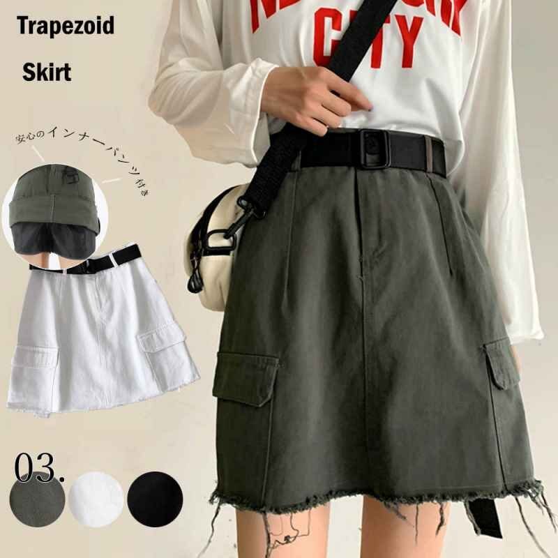 - ベルト付きスカート レディース ハイウエスト インナーパンツ スカート S ホワイト