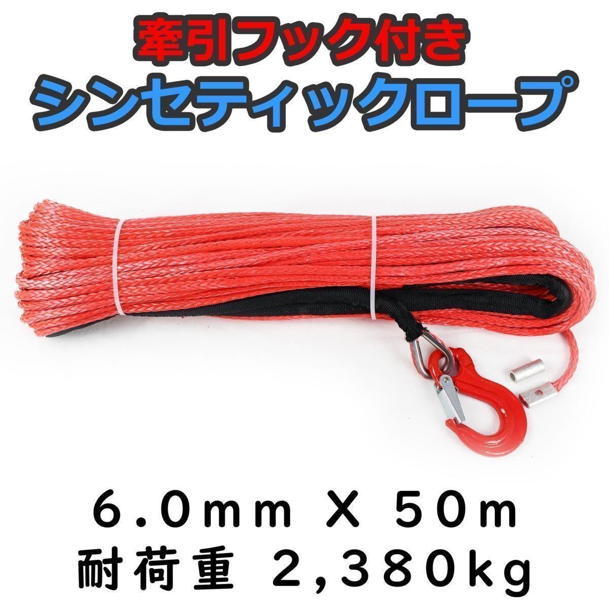 - フック付き シンセティックロープ レッド 6mm x 50m 耐荷重2380kg ウインチ等