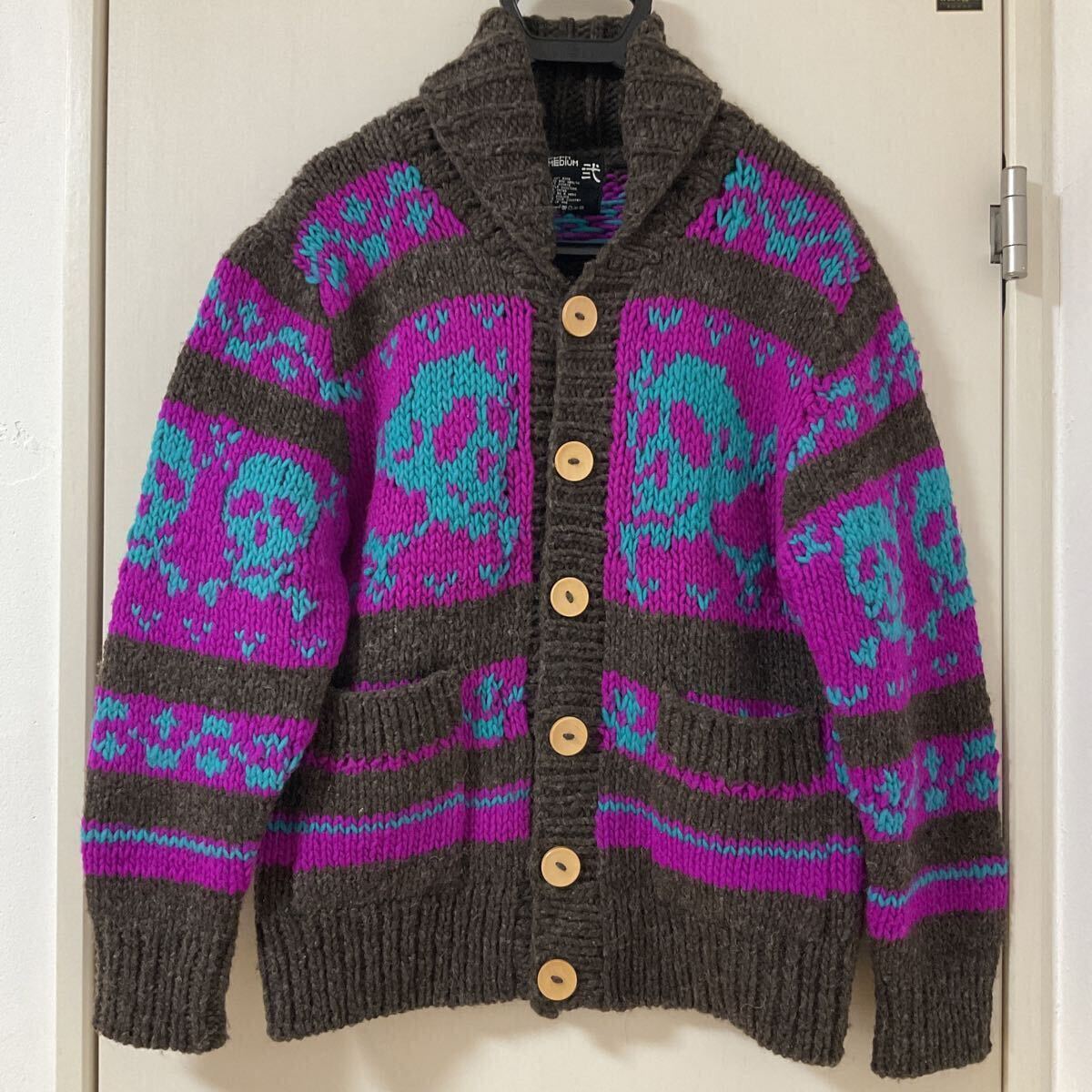 - 【数回着用のみ中古品】PPFM ローゲージニットカーディガン スカル柄 ピンク×ブラウン×水色 サイズ.M ペイトンプレイス メンズ