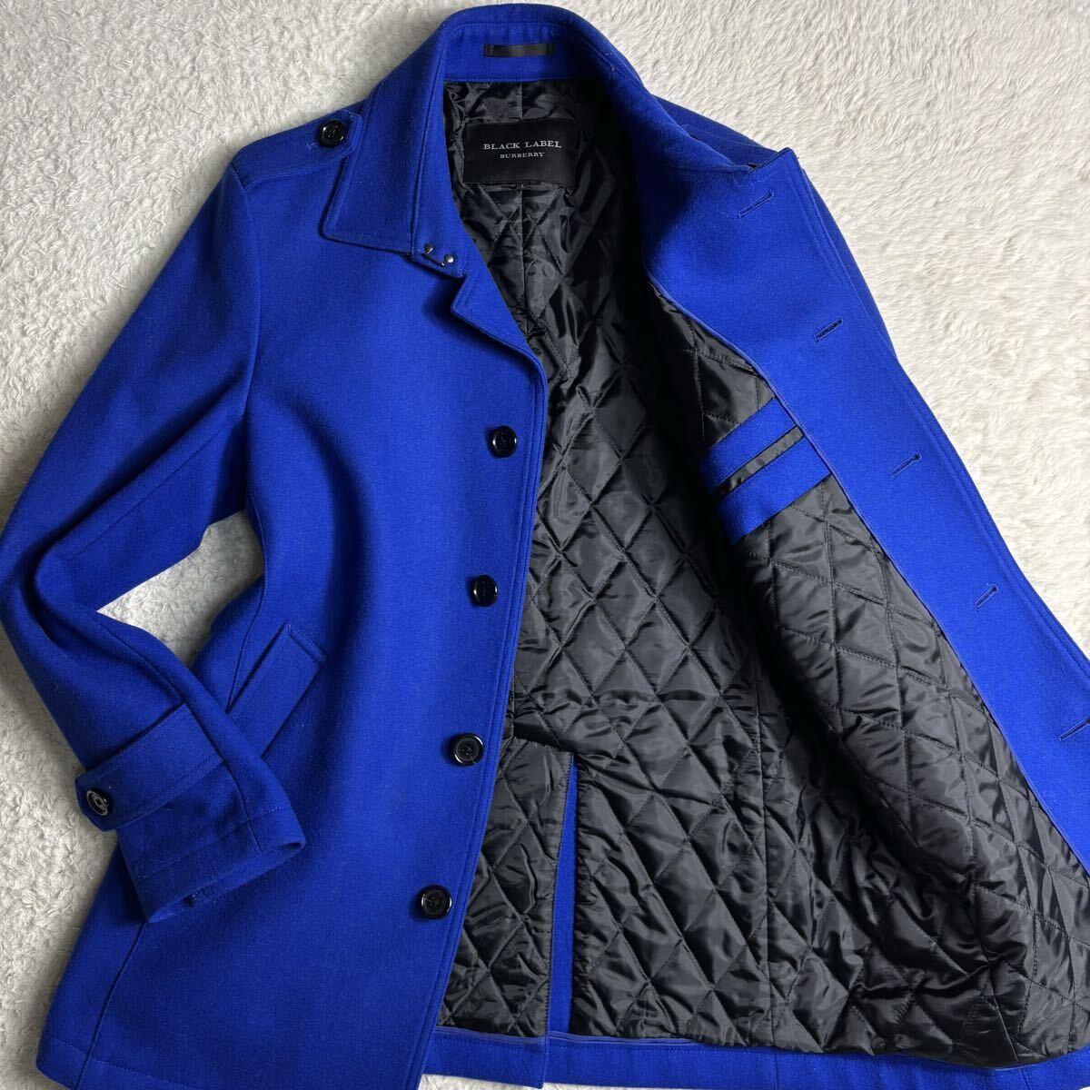 > 定価12万/極艶ブルー!!! ●BURBERRY BLACK LABEL バーバリー チェスターコート 最高級ウール トレンチPコート メンズ Lサイズ 大きめ 青色