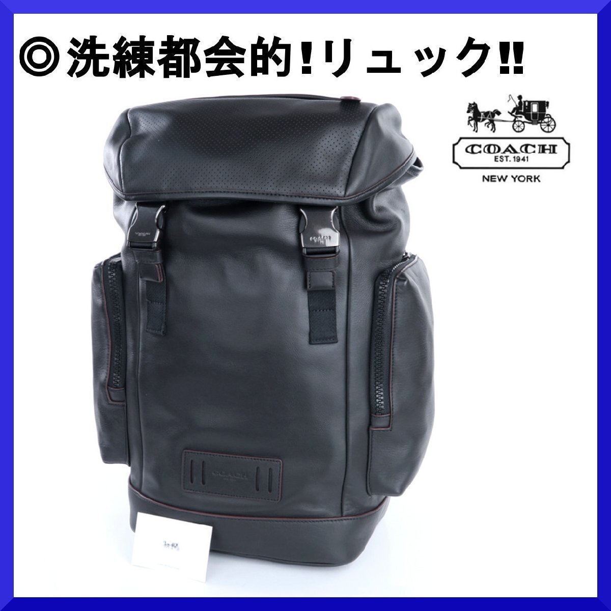 - 価格11万新品本物コーチCOACH【洗練◎都会的なデザイン】フラップ式!!本革レザーバックパック/リュックデイパック/ビジネスバッグ/メンズ黒