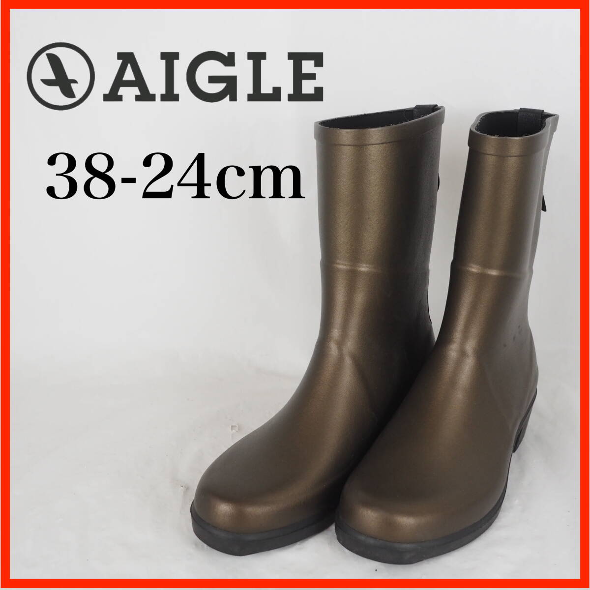 - GB0937*AIGLE*エーグル*レディースレインブーツ*38-24cm*光沢ある茶