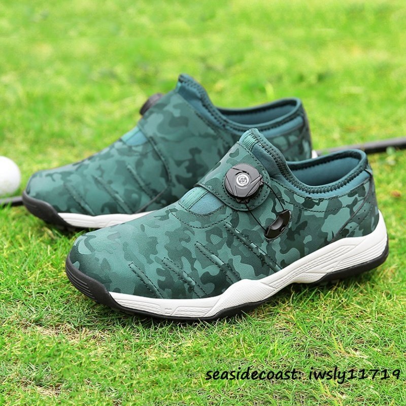 - 新作 迷彩柄 運動靴 ゴルフシューズ メンズ スパイクレス ダイヤル式 男女兼用 スポーツシューズ 4E 幅広 軽量撥水 通気性 グリーン 24.5cm