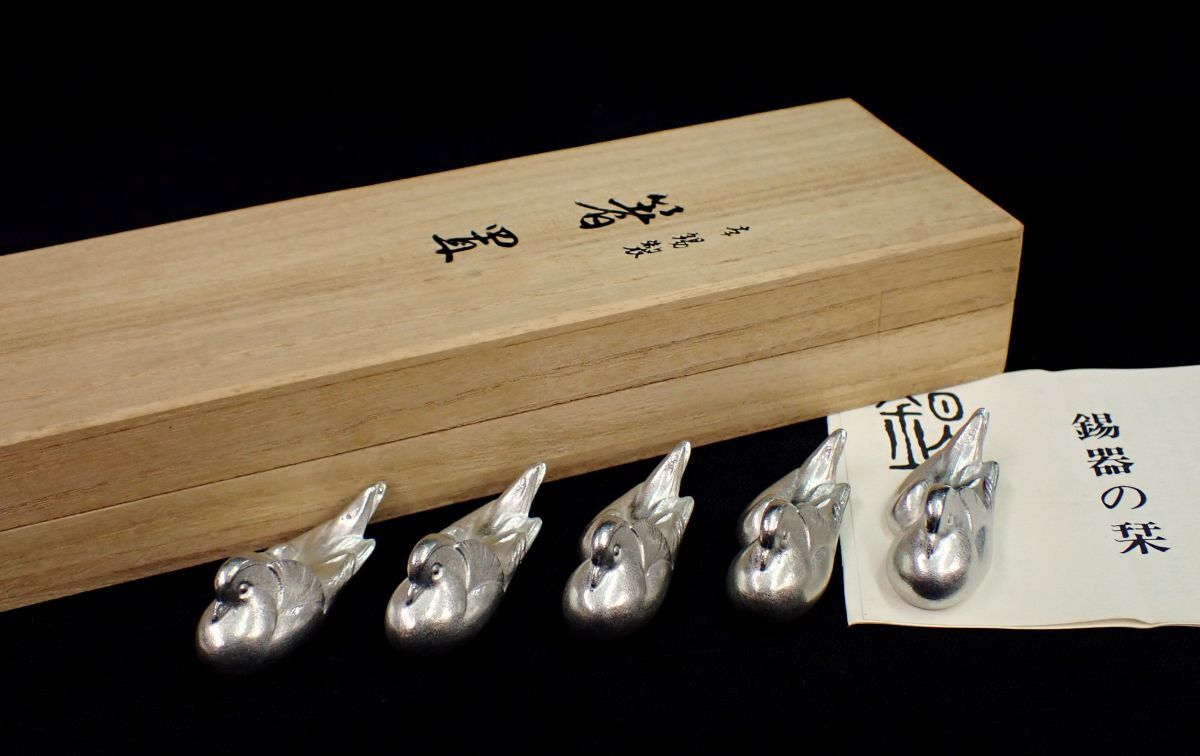 - ▲未使用 本錫「おしどり」箸置き 5客(直径約4.5cm)▲木箱付/消費税0円